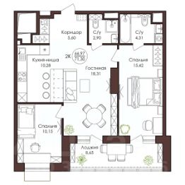 Планировка "Вся жизнь перед глазами". Мы бы так рассказали эту историю: "Дом, где она часами укладывала волосы, периодически поглядывая в окно на проезжую часть, ожидая его вишневый автомобиль. Он ехал за ней, торопясь, чтобы отвезти ее на театральную постановку, где она играла главную роль." Окна квартиры выходят на ул. Воронежскую - наблюдайте за жизнью города, попивая кофе на лоджии в кухне-гостиной. А в гардеробной разместите все свои наряды. В квартире два санузла.