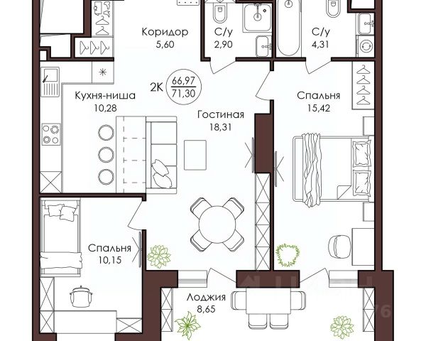 Планировка "Вся жизнь перед глазами". Мы бы так рассказали эту историю: "Дом, где она часами укладывала волосы, периодически поглядывая в окно на проезжую часть, ожидая его вишневый автомобиль. Он ехал за ней, торопясь, чтобы отвезти ее на театральную постановку, где она играла главную роль." Окна квартиры выходят на ул. Воронежскую - наблюдайте за жизнью города, попивая кофе на лоджии в кухне-гостиной. А в гардеробной разместите все свои наряды. В квартире два санузла.
