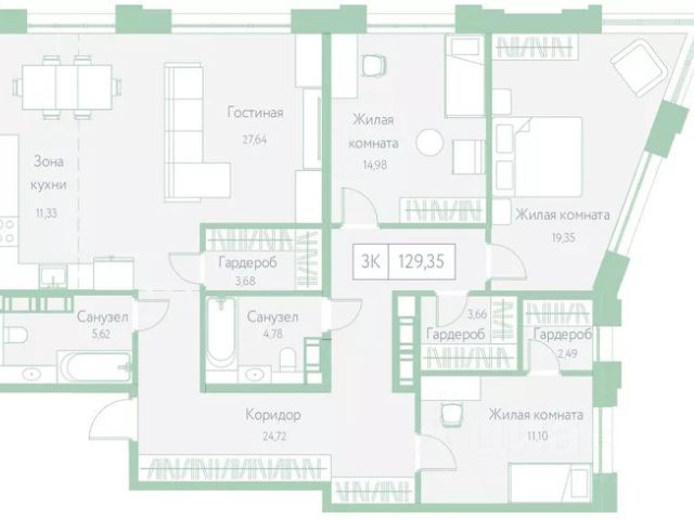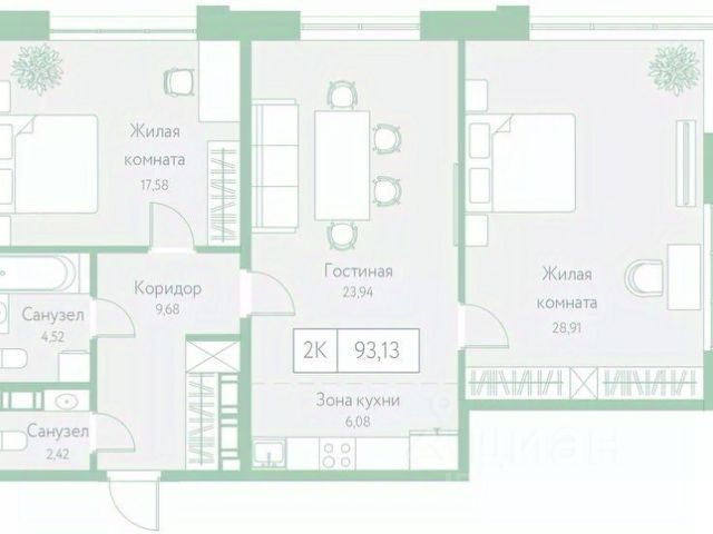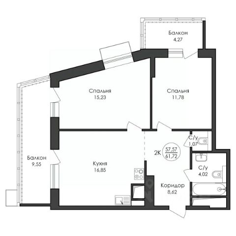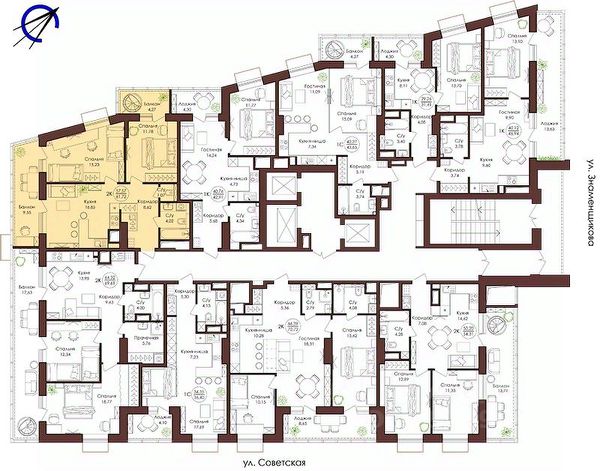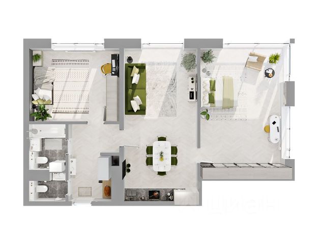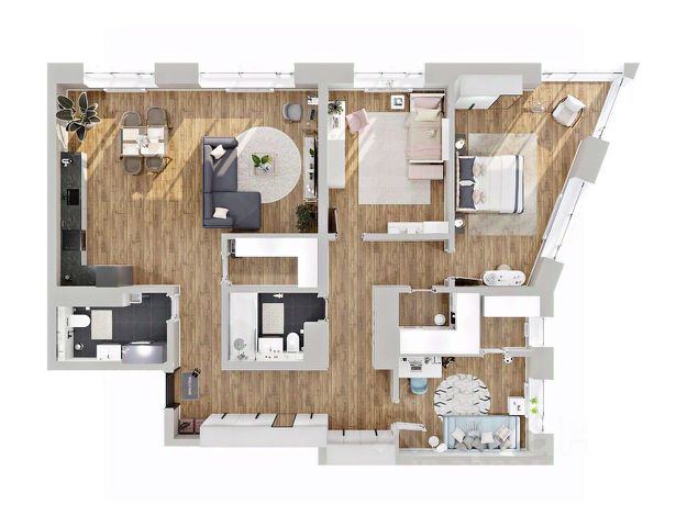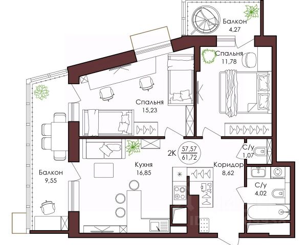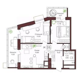 Оцените преимущество углового расположения 2+ квартиры — вид на две стороны света * Кухня-гостиная с возможностью зонирования мест для готовки и отдыха и выходом на балкон * Просторные спальни в которых легко расставить мебель для отдыха и работы * Два санузла * Большое количество гардеробных ниш сможет вместить основной объём вещей
