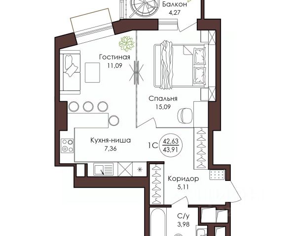 ЖК "Нордик": 1-комнатная квартира Площадь — 35,43 м². Срок сдачи 5 дома — IV квартал 2025 г. Отделка — предчистовая. Адрес — г. Хабаровск, ул. Известковая, 32/1. Просторная однокомнатная квартира с продуманной планировкой отлично подойдёт студентам или молодым семьям. В квартире: — прихожая 4,37 м² с нишей под гардероб; — большой совмещённый санузел 4,61 м²; — кухня площадью 10,11 м² с выходом на лоджию; — углубленная лоджия 5,22 м² с витражным остеклением; — гостиная-спальня площадью 13,73 м² с увеличенным окном и заниженным подоконником. ЖК "Нордик" — это 5 домов в едином архитектурном стиле в Северной части города. Здесь создана своя экосистема, включающая: — закрытый двор без машин с зонами отдыха для детей и взрослых; — сквозные подъезды с дизайнерским ремонтом и прозрачными дверьми; — кафе, магазины и фитнес на первых этажах зданий. Условия покупки: — ДВ ипотека от 0,6% — Семейная ипотека от 4,6% — Trade In (обмен старой квартиры на новую) — Скидка за каждого ребенка — Скидка 2% для участников СВО
