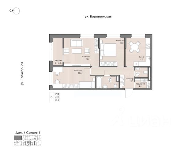 2-х комнатная квартира расположенная на 9-ом этаже 10-ти этажного дома в ЖК 4212 по ул Трехгорная д.106/3.Дом новый,2023 года постройки,сдан,квартиры в собственности.В основной части квартиры выполнен качественный ремонт с использованием дорогих современных материалов.Во всей квартире на полу новый испанский керамогранит,все стены выровнены,обои Roberto Borsagi,вся,электропроводка разведена,выводы под розетки,выключатели, кондиционеры.В сан.узле дорогой итальянский кафель,установлена ванна,инсталяция.Глубокая просторная лоджия с панорамным видом.Огороженная территория,видеонаблюдение,ландшафтный дизайн во дворе дома,современные детская и спортивная площадки,зона для отдыха.Рядом с домом Самбери,Лемана Про,остановка общественного транспорта,Ozon. Очень перспективный,быстро развивающийся район.Дом сдан,квартира в собственности,один взрослый собственник,зарегистрированных нет.Гарантируем быстрый выход на сделку