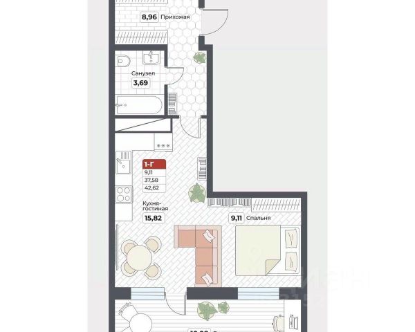 ЖК "Нордик": 1-комнатная квартира Площадь — 42,62 м². Срок сдачи 5 дома — IV квартал 2025 г. Отделка — предчистовая. Адрес — г. Хабаровск, ул. Известковая, 32/1. Идеальная однокомнатная квартира существует, и она перед вами! Комфортной для жизни её делает продуманная планировка: — просторная прихожая 8,96 м² с местом для хранения вещей; — совмещённый санузел 3,69 м²; — большая кухня-гостиная 15,82 м²; — уютная спальня 9,11 м²; — огромная лоджия 10,8 м² с витражным остеклением. Инфраструктура: — на территории комплекса: спортзал, кофейня, магазины, аптека, пункты выдачи заказов; — в шаговой доступности: школы, детские сады, ТОГУ; — в 5 минутах живописный парк Северный. Условия покупки: — ДВ ипотека от 0,6% — Семейная ипотека от 4,6% — Trade In (обмен старой квартиры на новую) — Скидка за каждого ребенка — Скидка 2% для участников СВО