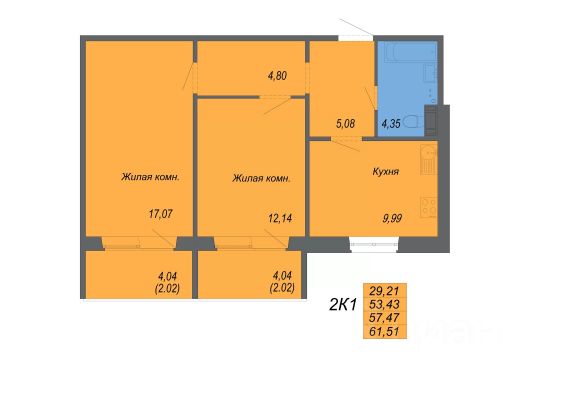 Просторная кухня 6 кв.м. и раздельный санузел.