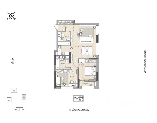 2,5-комнатная квартира в для семьи с ребёнком; Кухня-гостиная с зонированием мест для готовки и отдыха; Просторные спальни позволят с организовать комфортные места для отдыха и работы; Просторный балкон даст возможность поставить мебель для отдыха или организовать хранение вещей; Высота потолков 2,7 метра; Два санузла