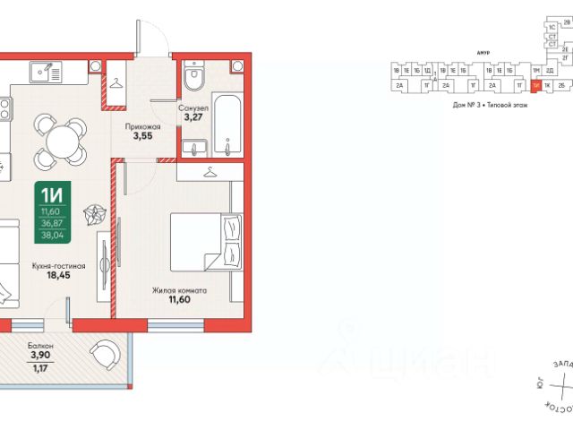 Общая площадь без учёта балкона 45 кв.м., кухня-11,2 кв.м. с выходом на балкон -2,7 кв.м., комната 21,3 кв.м., просторный санузел 6,1 кв.м. и прихожая 6,4 кв.м.,