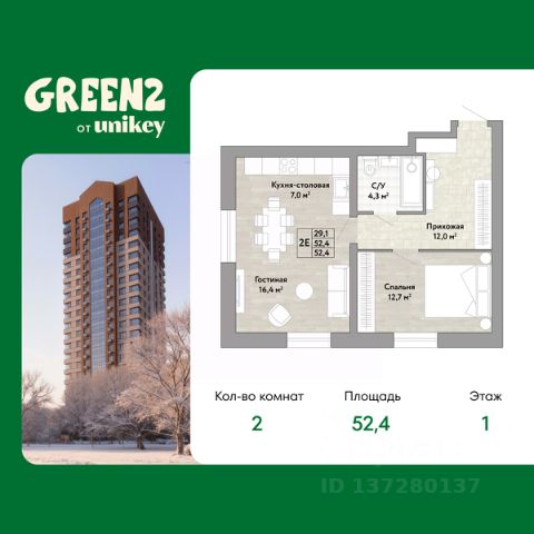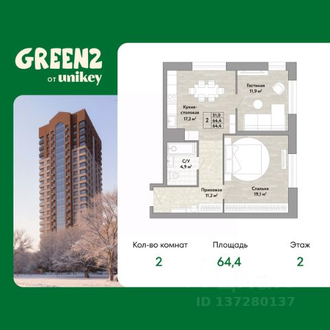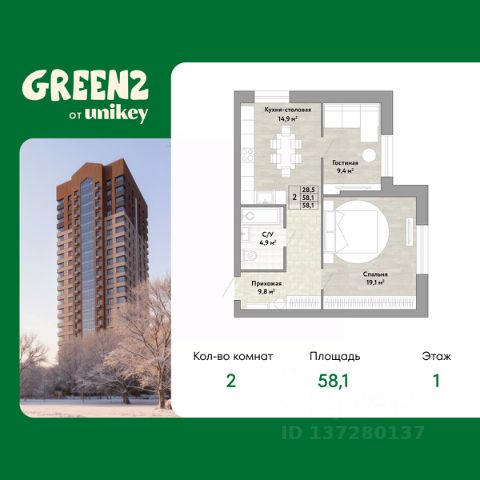 2-комн. квартира в ЖК "Green 2" на 1 этаже. Общая площадь: 58.1 кв.м. Высота потолков 2.7 м.