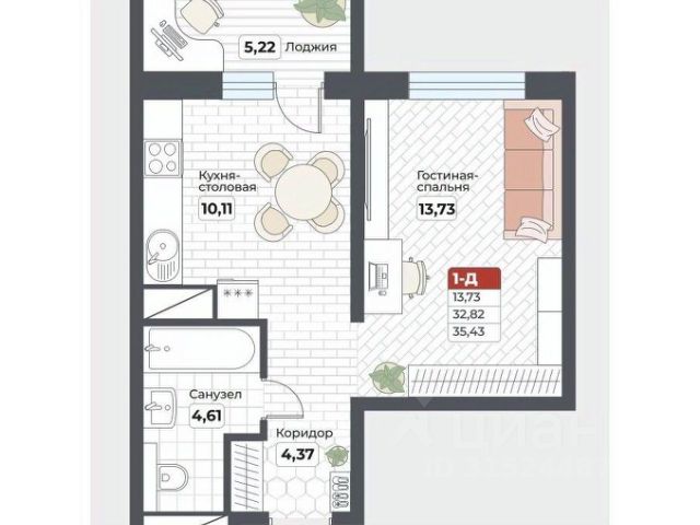 ЖК "Нордик": 1-комнатная квартира Площадь — 35,43 м². Срок сдачи 5 дома — IV квартал 2025 г. Отделка — предчистовая. Адрес — г. Хабаровск, ул. Известковая, 32/1. Просторная однокомнатная квартира с продуманной планировкой отлично подойдёт студентам или молодым семьям. В квартире: — прихожая 4,37 м² с нишей под гардероб; — большой совмещённый санузел 4,61 м²; — кухня площадью 10,11 м² с выходом на лоджию; — углубленная лоджия 5,22 м² с витражным остеклением; — гостиная-спальня площадью 13,73 м² с увеличенным окном и заниженным подоконником. ЖК "Нордик" — это 5 домов в едином архитектурном стиле в Северной части города. Здесь создана своя экосистема, включающая: — закрытый двор без машин с зонами отдыха для детей и взрослых; — сквозные подъезды с дизайнерским ремонтом и прозрачными дверьми; — кафе, магазины и фитнес на первых этажах зданий. Инфраструктура: — в шаговой доступности: школы, детские сады, ТОГУ; — в 5 минутах живописный парк Северный. Условия покупки: — ДВ ипотека от 0,6% — Семейная ипотека от 4,6% — Trade In (обмен старой квартиры на новую) — Скидка за каждого ребенка — Скидка 2% для участников СВО