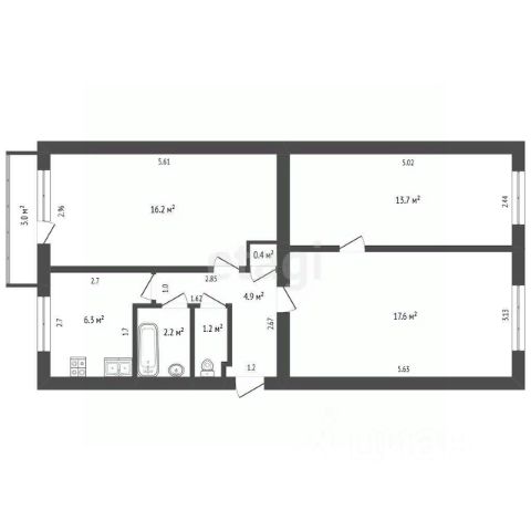 Общая площадь квартиры 43.8 кв.м.; жилая 29.0 кв.м.; кухня 5.3 кв.м.; комнаты 13.0 кв.м. и 16.0 кв.м.; санузел смежный; высота потолков 2.5