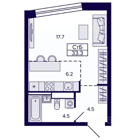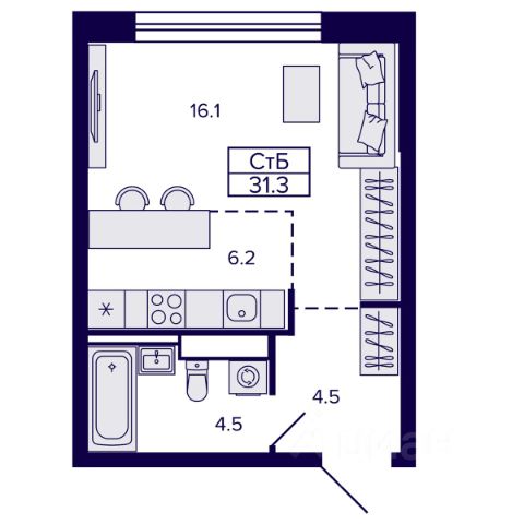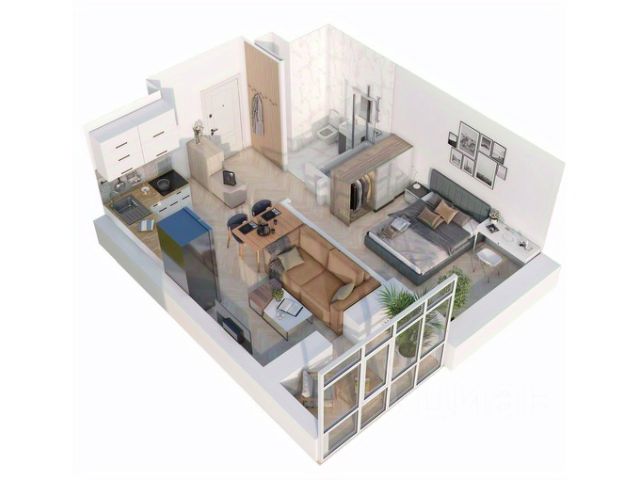 Уютная 1+ квартира для молодой семьи и людей, ценящих спокойную и уединённую жизни; Просторная кухня-гостиная с зонированием мест для готовки и отдыха; Отдельная спальня позволит сохранить приватное пространство; Широкая лоджия может стать как местом для хранения, так и местом для релакса