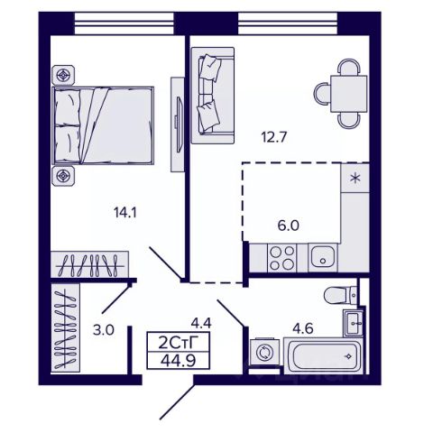 Просторная светлая 1-комнатная квартира 33-36 м². Здесь спальня, кухня-гостиная, комфортный санузел, гардеробная и постирочная, а также лоджия, которую можно оборудовать как зону отдыха или кабинет.