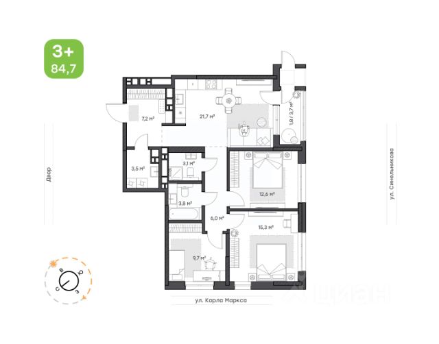 Высокие потолки 2,85-3,15 м и большие окна до 1,8 м