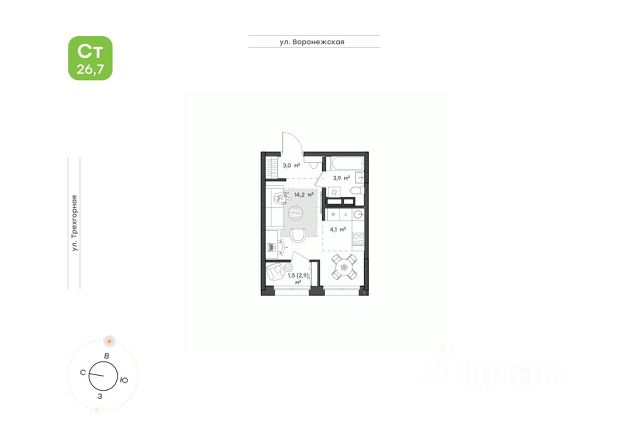 Уютная и атмосферная студия, где есть все необходимое • Прихожая 4,1 кв.м с нишей под гардероб обеспечит порядок и удобное хранение ваших вещей; • Кухня-ниша с выходом на просторную лоджию станет удобным пространством для создания кулинарных шедевров; • Можно завтракать у окна и собираться в гостиной с друзьями; • Совмещенный санузел 3,2 кв.м.