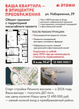 Покупай сейчас - плати потом! На данный объект доступна рассрочка на выгодных условиях Просторная двухкомнатная квартира 92 м² в сердце Хабаровска! Мечтаете о бесценном статусе и абсолютном комфорте в самом эпицентре городской жизни? Ваш поиск завершен! Предлагаем эксклюзивную квартиру на 5 этаже в престижном доме на площади им. Ленина. Главные козыри этого лота: Вид из окон, который продает себя сам: Вы сможете наблюдать за парадами, городскими праздниками и живописными пейзажами городских прудов, не выходя из дома. Окна выходят на солнечную сторону, во двор и на улицу, наполняя пространство светом. Простор для воплощения мечты: Квартира 92 м² с черновой отделкой — это чистый лист для вашего дизайнера. Вам не придется тратиться на демонтаж старого ремонта, что сэкономит время и бюджет. Создайте интерьер своей мечты с нуля! Тишина и уединение в центре города: Уникальная особенность — толстые стены в 2 кирпича, которые полностью изолируют от шума соседей. Это редкая возможность наслаждаться спокойствием, живя в самом оживленном месте. Детали планировки: Общая площадь: 92 м² Кухня: 23,7 м² — здесь легко поместится и просторная обеденная зона, и барная стойка. Жилая площадь: 40,5 м² (две изолированные комнаты) — идеально для семьи с ребенком или для тех, кто ценит личное пространство. Высота потолков: 2,75 м — ощущение простора и свободы. Дополнительные площади: Балкон и лоджия — для утреннего кофе или завтрака на свежем воздухе с потрясающим видом на городские пруды. Санузел: Раздельный — максимальное удобство утром для всей семьи. Локация — 10/10: Квартира находится в сердце города. По соседству — Правительство Хабаровского края. В шаговой доступности: Дальневосточный государственный медицинский университет, РАНХиГС, лучшие школы, бутики, торговые центры, а также все ключевые культурные и развлекательные площадки. Все самое важное — буквально за углом. Это не просто квартира, это — выгодная инвестиция в престижную локацию и ваш уникальный стиль жизни. ТОРГ ВОЗМОЖЕН РАССМОТРИМ ЛЮБЫЕ ВАРИАНТЫ РАСЧЕТА ВОЗМОЖНА РАССРОЧКА ОТ СОБСТВЕННИКА Свяжитесь с нами прямо сейчас, чтобы назначить просмотр и оценить все преимущества этого предложения! Код пользователя: 175092 Номер в базе: 9566794
