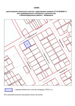Земельный участок с с местоположением: Хабаровский край, г. Хабаровск, ул. Рассветная, дом 4. Вид разрешенного использования строительство индивидуального жилого дома. Кадастровый номер - 27:23:0040240:11 Площадь - 1010 кв. м...