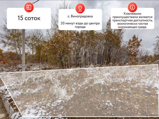 Предлагается вашему вниманию! Земельный участок, общей площадью 15 соток земли в собственности (межевание сделано) Местоположение: Село Виноградовка ул. Аверьяновская кадастровый номер: 27:17:0300202:492 Экологически чистый районе, в близи реки Амур. - Хорошие подъездные пути, дорога асфальтирована; -Проходит газификация природного газа ! -Проводной интернет -Улица электрофицированна - В посёлке есть школа (одна из самых лучших в Хабаровском крае), детский сад, магазины, базы отдыха Белый парус - соседи приличные, коттеджная застройка; вода: соседи в округе бурят скважины, питьевая вода на 20-ти метрах; - от Хабаровска 6.5 км. 7 минут на машине, 20 минут на автобусе. -Рядом с участком есть небольшой водоем Есть отличная возможность заниматься животноводством Подходит под Ипотеку! Помощь в одобрении ипотеки Звоните и записывайтесь на показ Продается участок 15 соток в Хабаровском крае.