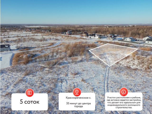 Покупай сейчас - плати потом! На данный объект доступна рассрочка на выгодных условиях Продам участок 5 соток под строительство дома в селе Краснореченском! Участок ровный, находится в районе, где активно ведется застройка, что делает его идеальным для индивидуального жилого строительства. - 35 минут от города на автомобиле - Электрические столбы в непосредственной близости от участка. - Подходит под льготные ипотечные программы - Категория земель: земли населенных пунктов - Вид разрешенного строительства: ИЖС Один собственник. Долгов нет. Звоните, записывайтесь на просмотр, отвечу на все интересующие вопросы! Наталья. Код пользователя: 187469 Номер в базе: 10929630