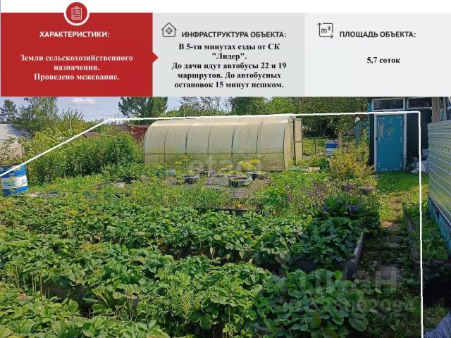 Дачный участок расположен в 5 минутах езды от спортивного комплекса "Лидер", в местности с развитой инфраструктурой. Транспортная доступность обеспечивается автобусами маршрутов 22 и 19 — остановки находятся в 15 минутах неспешной ходьбы. К домику подключено электричество, имеется парковочное место, летнее водоснабжение, рядом озеро, установлены емкости для сбора дождевой воды. На территории имеется беседка для отдыха и две теплицы, позволяющие выращивать овощи и зелень в течение всего сезона, растут ягодные кустарники (жимолость, малина, белая, красная и гибридная черная смородина), а также молодые плодовые растения: вишня, крыжовник, ежевика. Отдельно организованы 8 грядок под клубнику. Место идеально подходит для тех, кто ценит тишину, чистый воздух и возможность заниматься садоводством без необходимости длительных переездов или под строительство собственного дома. Звоните, обеспечим показ в удобное для вас время. Код пользователя: 126742 Номер в базе: 8629930