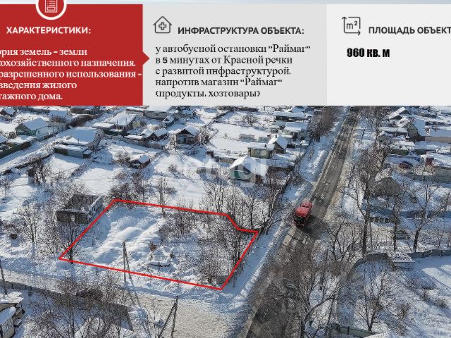Отличный участок под строительство в районе Овощесовхоза, 5 минут от улицы Краснодарская. Предлагаем отличный участок под строительство коттеджа или жилого дома в СТ "Восход". Участок состоит из двух смежных между собой участков, в объявлении указана общая площадь, площадь участка с отмеченным кадастровым номеров 6,5 соток. Второй участок имеет кадастровый номер 27:23:0040612:340 и имеет площадь 3,3 сотки. Цена указана за оба участка, форма геометрически правильная, без уклона. Рядом расположен небольшой ручей, что делает вид особенно живописным. На границе участка располагается опора ЛЭП, что очень удобно для быстрого подключения электричества. Вокруг активно ведется застройка жилыми домами и коттеджами. Удобное расположение позволяет быстро добраться до центра города или в ином направлении. Рядом расположены школа 14, детский сад. Остановка автобусов 13, 40, 82. Недалеко расположен конный клуб Арагон, спортивный зал. Торопитесь записаться на просмотр, пока действует "зимняя цена" на участок! Отличный участок 9 соток.