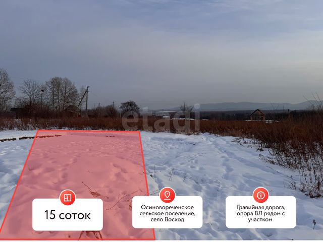 Продается земельный участок 15 соток в живописном селе Восход (Осиновореченское с/п)! Ваш шанс построить дом мечты в перспективном и быстро развивающемся месте! Участок расположен в активно застраивающемся частном секторе — это говорит о востребованности и росте инфраструктуры. Главные преимущества: Идеальная локация: Тишина, покой и чистейший воздух в окружении природы, но при этом — всего 30 минут на машине до центра города. Развитие района гарантирует рост рыночной стоимости вашей недвижимости. Потрясающие виды: Участок абсолютно ровный, с открытой панорамой на живописные сопки и знаменитые сибирские закаты необыкновенной красоты. Ваша терраса будет самым любимым местом в доме. Коммуникации и доступ: К участку ведет качественная гравийная дорога, что обеспечивает подъезд в любое время года. Рядом уже стоит электрический столб — существенная экономия на подключении. Инфраструктура поблизости: В шаговой доступности известная сеть саун "Приват" для отдыха с семьей и друзьями. До остановки общественного транспорта (автобус маршрута 177) — 16 минут неспешной прогулки. Это не просто земля — это готовый фундамент для вашего будущего. Участок ждет рачительного хозяина, готового первым построить здесь свой уютный дом в гармонии с природой. Отличная инвестиция в себя и свое будущее! Цена адекватная. Все вопросы и просмотр — по телефону. Звоните прямо сейчас! Код пользователя: 189201 Номер в базе: 10746325