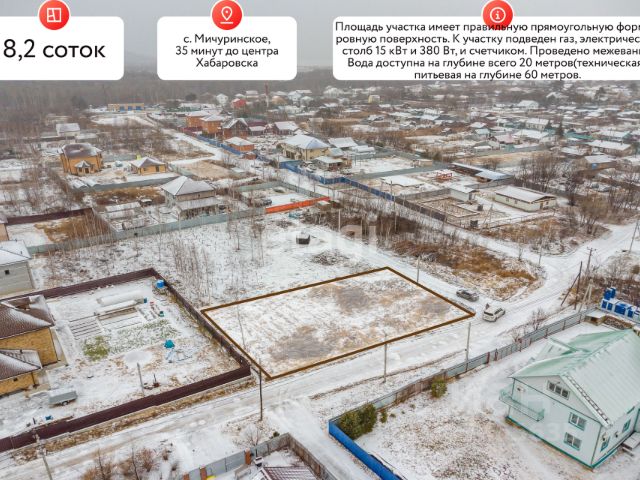 От участка до центра Хабаровска 30 минут езды на автомобиле по живописной дороге (автодорога "Амур"). Развитая инфраструктура Мичуринского сельского поселения делает его весьма привлекательным для жизни: новая отличная школа, детский сад, магазины, аптека.
