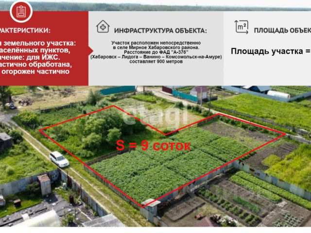 У вас есть уникальная возможность стать счастливым обладателем земельного участка в живописном районе села Мирное Хабаровского района! Площадь участка - 9 соток, что позволит вам реализовать любые свои строительные и дизайнерские задумки. Земельный участок идеально подойдёт для строительства вашего собственного уютного дома или загородной виллы. Рядом с участком проходят грунтовые подъездные пути, что обеспечит вам удобный доступ к вашему будущему дому. Рядом с участком уже установлен электрический столб, что значительно упростит подключение к электроснабжению. Все документы на оформлены в полном объеме, что гарантирует вам безопасную и прозрачную сделку. Мы предоставляем полное юридическое и личное сопровождение, помощь в одобрении ипотеки, а также гарантированно выдаем "ГАРАНТИЙНЫЙ СЕРТИФИКАТ" при сделках до 10 млн. рублей. Не упустите свой шанс приобрести эти уникальные участки и построить свой долгожданный дом в живописном месте! Звоните прямо сейчас, и я, Константин Кортелев, отвечу на все ваши вопросы и помогу вам осуществить вашу мечту о собственном жилье! Код пользователя: 43519 Номер в базе: 8625384