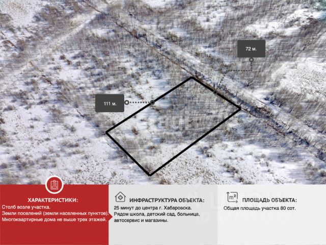 Продам участок под строительство в перспективном районе города. Уже обжитой посёлок активно благоустраивается. В планах закрытая охраняемая территория, ТСЖ и асфальтированная дорога до участка. В настоящий момент асфальт до посёлка, далее до участка-грунт, электричество по улице, у участка столба нет. Участок ровный, правильной прямоугольной формы, высокий, сухой. Дружные соседи. Рядом озеро. Городская прописка. Приглашаю на просмотр. Ваш эксперт по недвижимости, Данилюк Анна. Код пользователя: 116402 Номер в базе: 8564979 Продам земельный участок в Хабаровском крае.