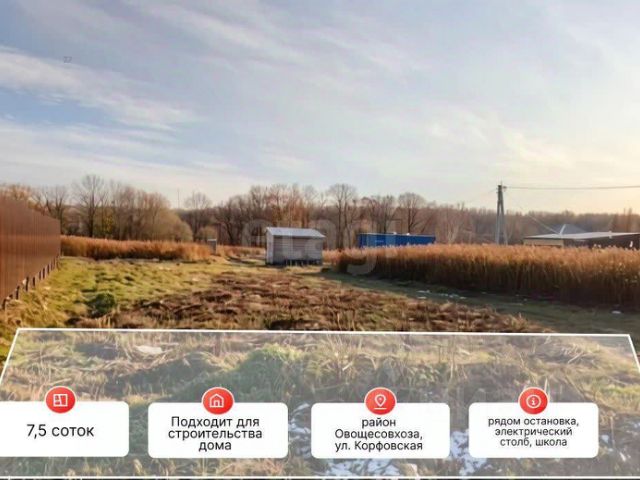 Идеальный участок под строительство дома в районе Овощесовхоза (ул. Корфовская). Представляю вашему вниманию аккуратный, ровный участок на тихой улице Корфовская, площадью 7,5 соток. Участок правильной прямоугольной формы, без перепадов высот, ровный. Подключение к сетям облегчено — на въезде в ваш будущий дом уже установлен столб с электричеством. К участку ведет хорошая, отсыпанная дорога. Проедет любая машина в любую погоду. Заезд возможен как с улицы Краснодарской, так и с Лучистой. До школы и остановки общественного транспорта рукой подать — очень удобно для детей и взрослых. Полная готовность к сделке: межевание проведено. Записывайтесь на показ. Код пользователя: 190374 Номер в базе: 12031718