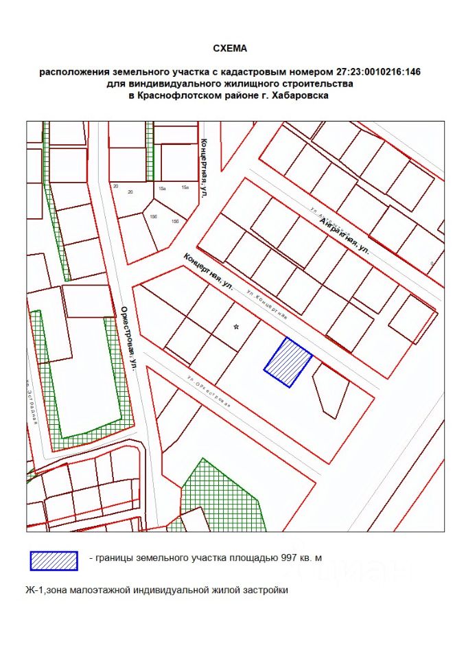 Земельный участок с местоположением: Хабаровский край, г. Хабаровск, примерно в 150 м по направлению на юго-восток от ориентира жилое здание, расположенного за пределами участка, адрес ориентира: ул. Концертная, д. 15б. Вид разрешенного использования для индивидуального жилищного строительства. Кадастровый номер - 27:23:0010216:146 Площадь - 997 кв. м Форма собственности неразграниченная. Категория земель - земли населенных пунктов.