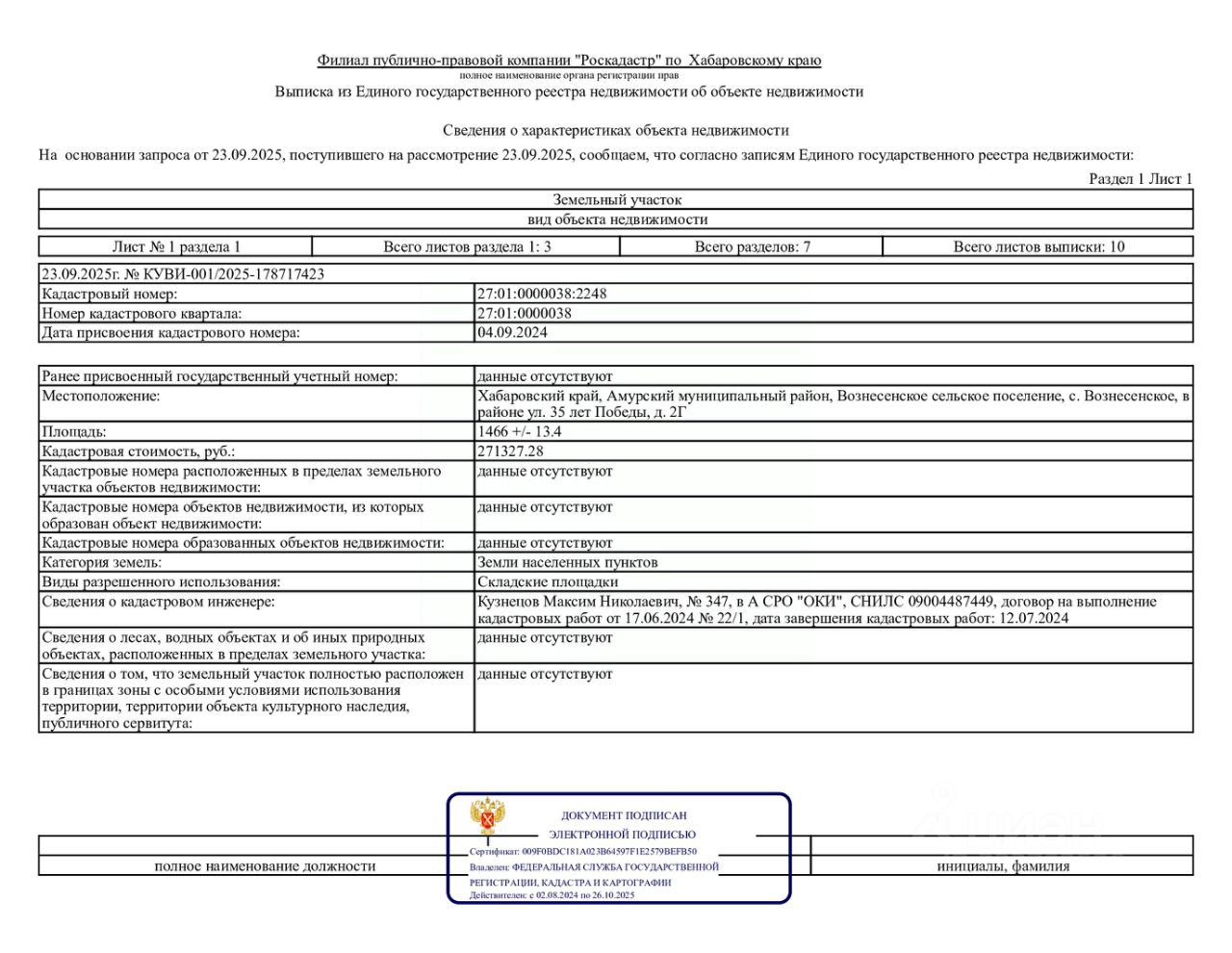 Земельный участок, государственная собственность на которого не разграничена, из земель категории земли населенных пунктов, с кадастровым номером 27:01:0000038:2248, площадью 1466 кв. метров, расположенного по адресу Хабаровский край, Амурский муниципальный район, Вознесенское сельское поселение, с. Вознесенское, в районе ул. 35 лет Победы, д. 2Г,в территориальной зоне К "Коммунальная зона" вид разрешенного использования: "Складские площадки" (код вида 6.9.1)