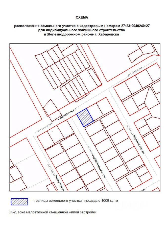 Земельный участок с местоположением: край Хабаровский, г. Хабаровск, ул. Рассветная, дом 8. Вид разрешенного использования для индивидуального жилищного строительства. Кадастровый номер - 27:23:0040240:27 Площадь - 1008 кв. м Форма собственности неразграниченная. Категория земель - земли населенных пунктов.