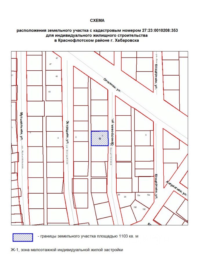 Земельный участок с местоположением: Хабаровский край, г. Хабаровск, примерно в 30 м по направлению на запад от ориентира - жилое здание, расположенного за пределами участка, адрес ориентира: улица Оркестровая, дом 28. Вид разрешенного использования для индивидуального жилищного строительства. Кадастровый номер - 27:23:0010208:353 Площадь - 1103 кв. м Форма собственности неразграниченная. Категория земель - земли населенных пунктов.