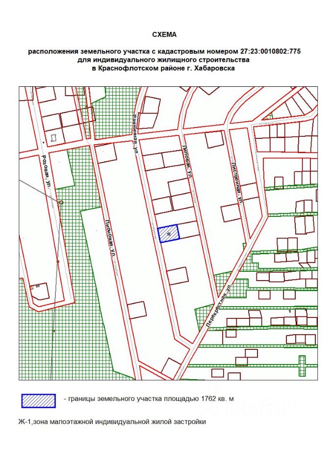 Земельный участок с местоположением: Хабаровский край, г. Хабаровск, примерно в 400 м по направлению на юго-запад от ориентира - жилое здание, расположенного за пределами участка, адрес ориентира: ул. Липовая, дом 101. Вид разрешенного использования для индивидуального жилищного строительства. Кадастровый номер - 27:23:0010802:775 Площадь - 1 762 кв. м Форма собственности неразграниченная. Категория земель - земли населенных пунктов.