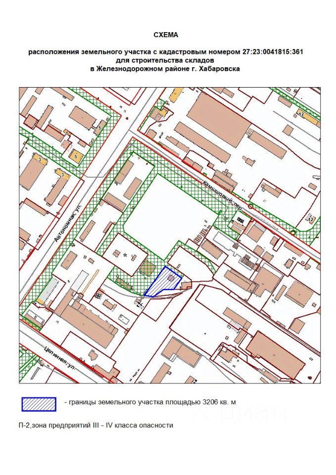 Земельный участок с местоположением: Хабаровский край, г. Хабаровск, Железнодорожный р-н, ул. Автономная. Вид разрешенного использования Склады. Кадастровый номер - 27:23:0041815:361. Площадь 3 206 кв. м. Форма собственности неразграниченная. Категория земель - земли населенных пунктов.