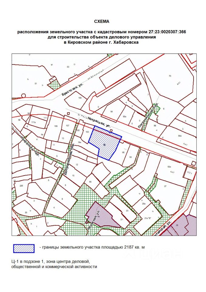 Земельный участок с местоположением: Хабаровский край, г. Хабаровск, ул. Некрасова. Вид разрешенного использования деловое управление. Кадастровый номер - 27:23:0020307:366 Площадь 2187 кв. м Форма собственности неразграниченная Категория земель - земли населенных пунктов.
