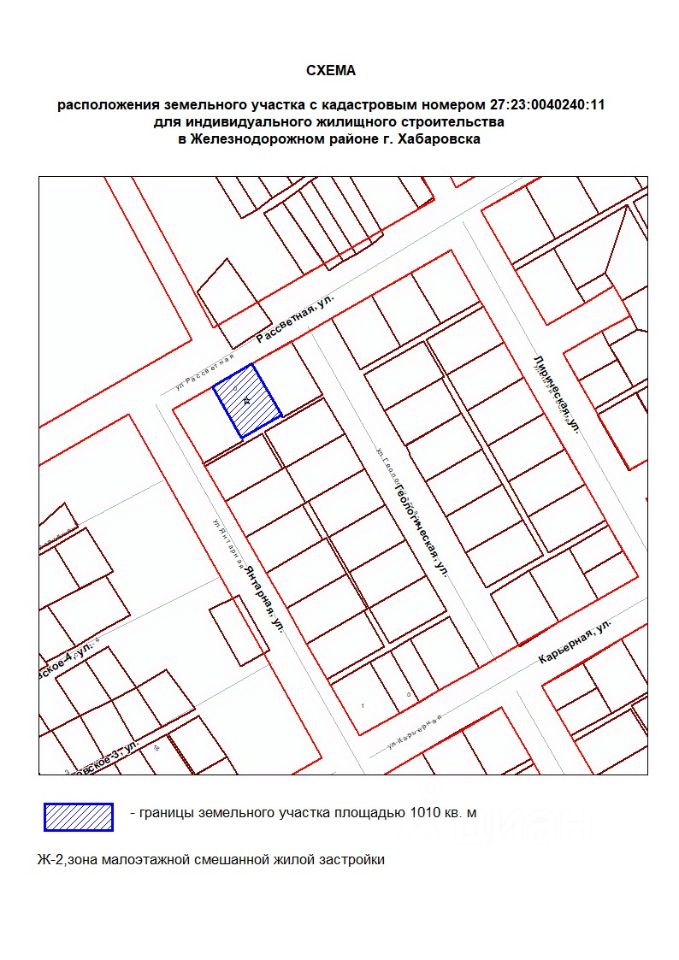 Земельный участок с местоположением: Хабаровский край, г. Хабаровск, ул. Рассветная, дом 4. Вид разрешенного использования для индивидуального жилищного строительства. Кадастровый номер - 27:23:0040240:11. Площадь - 1010 кв. м. Форма собственности неразграниченная. Категория земель - земли населенных пунктов.