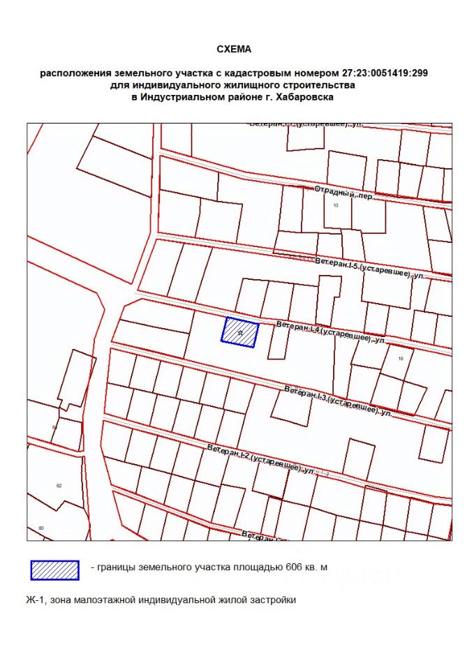 Земельный участок с местоположением: Хабаровский край, г Хабаровск, примерно в 40 м по направлению на юго-восток от ориентира - жилое здание, расположенного за пределами участка, адрес ориентира: ул. Ветеран 1-5, уч. 4. Вид разрешенного использования для индивидуального жилищного строительства. Кадастровый номер - 27:23:0051419:299 Площадь - 606 кв. м Форма собственности неразграниченная. Категория земель - земли населенных пунктов.