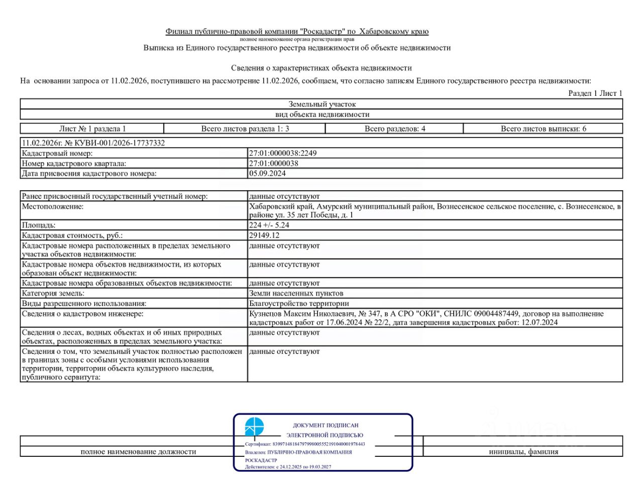 Местоположение земельного участка с кадастровым номером 27:01:0000038:2249, Хабаровский край, Амурский муниципальный район, Вознесенское сельское поселение, с. Вознесенское, в районе ул. 35 лет Победы, д. 1