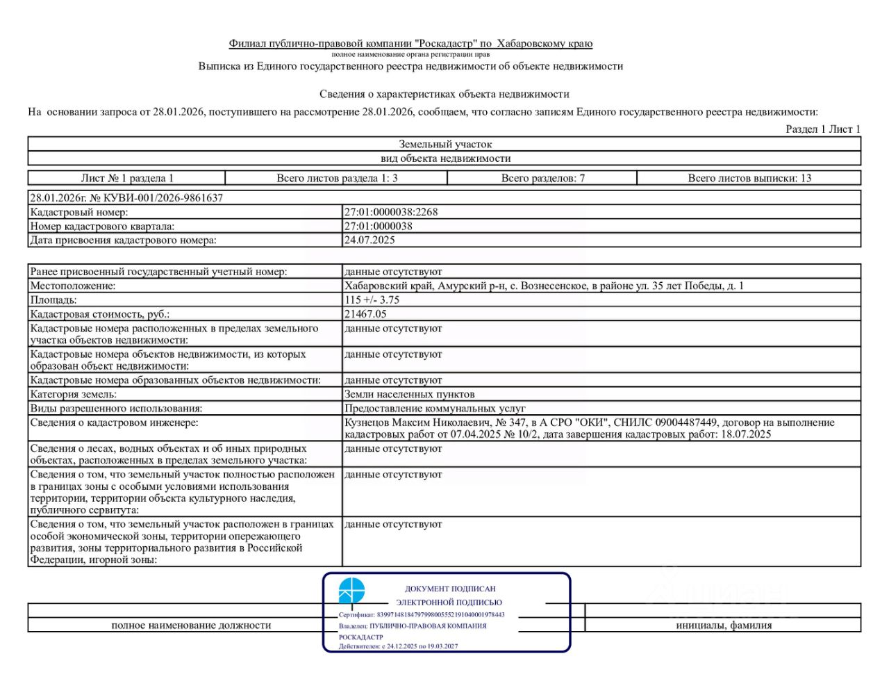 Земельный участок с кадастровым номером 27:01:0000038:2268 площадь 115 по адресу Хабаровский край, Амурский р-н, с. Вознесенское, в районе ул. 35 лет Победы, д. 1