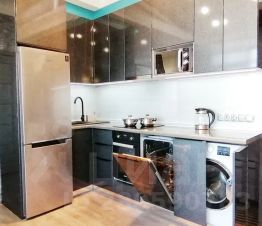 Кухня стильная и функциональная. Мы не ограничились плитой и микроволновой печью и добавили духовой шкаф и посудомоечную машину. Дерзайте воплощать свои кулинарные идеи!