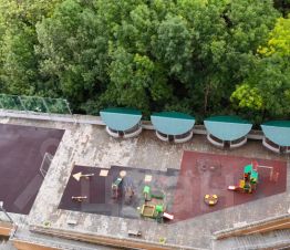 Во дворе современная детская площадка, беседки, за ним расположена зеленая зона паркадендрарий, где можно послушать пение птиц и увидеть белочек, он всегда открыт для прогулок