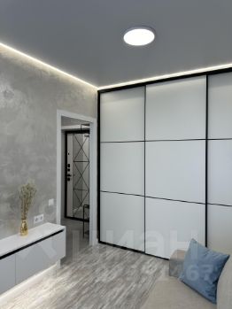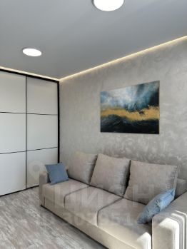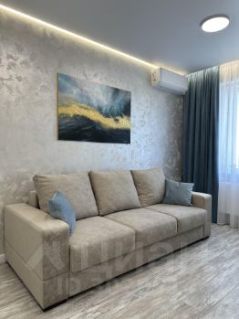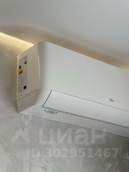 * В гостиной ламинат, парящий натяжной потолок с подсветкой, подвесная ТВ-тумба с подсветкой, вместительный шкаф-купе, диван, кондиционер.