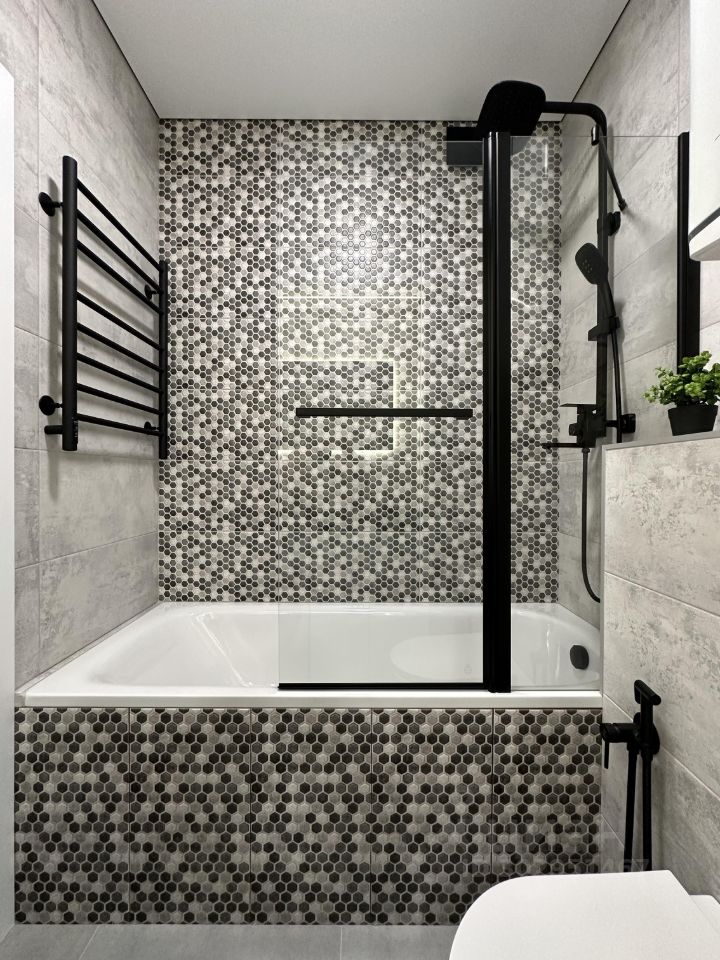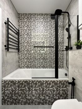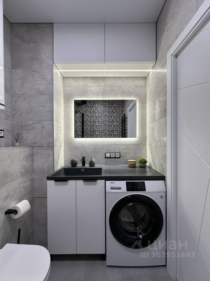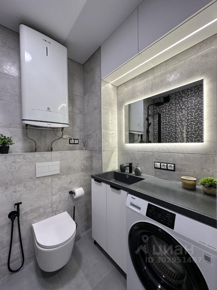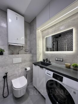 * В санузле установлен электрический водонагреватель на 80 литров, инсталляция с подвесным унитазом, гигиенический душ со смесителем, душевая стойка с тропическим душем, ванна 170x70 с душевой перегородкой, электрический полотенцесушитель скрытого подключения, инверторная стиральная машина с функцией пара, зеркало и хозяйственный шкаф с подсветкой, большая раковина 120 см.