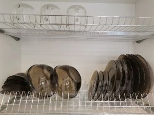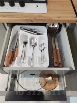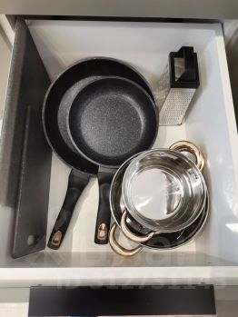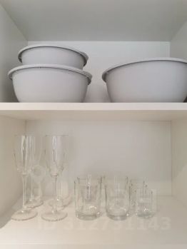 Кухня укомплектована необходимой бытовой техникой и посудой для приготовления еды и сервировки стола.