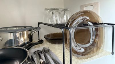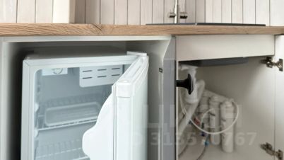 - кухонная зона с фильтрованной водой, раковиной, нагревательной панелью, микроволновкой, чайником и посудой;