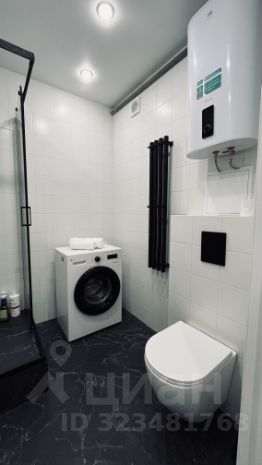 Стильная ванная комната с душевой кабиной, бойлером, стиральной машиной, унитазом, раковиной на большом столе и огромным зеркалом!