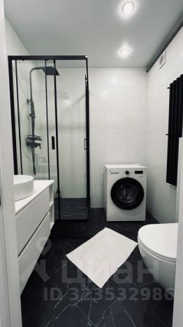 Стильная ванная комната с душевой кабиной, бойлером, стиральной машиной, унитазом, раковиной на большом столе и огромным зеркалом!