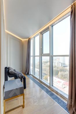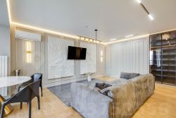 Стиль и комфорт: Просторная квартира с модным ремонтом, панорамными окнами и видом на город. Четкое зонирование на гостевую зону с удобным диваном и уединенную спальную зону.