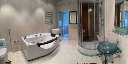 Совмещенный с сан. узел с ванной и душ. кабиной. Сан.узел с окнами, с отдельным небольшим помещением под прачечную/кладовую.