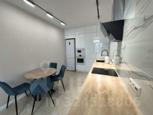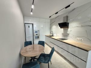 Кухня со встроенной бытовой техникой: индукционная варочная панель, вытяжка, духовой шкаф, микроволновая печь, фильтр для питьевой воды, посудомоечная машина, холодильник, чайник.