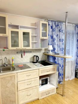 Компактная кухня оборудована всей нужной для длительного проживания бытовой техникой. В распоряжении гостей квартиры полный комплект посуды и кухонной утвари на четыре персоны, чтобы чувствовать себя как дома и готовить привычный рацион по своему вкусу.